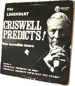 In between hosting his own TV show, conjuring up a couple books (Criswell Predicts Your Next Ten Years!) and carousing with Wood's band of merry washouts, "Cris" managed to produce at least one vinyl record of scarifying predictions. Without further ado, then, we present written transcripts for your perusal.