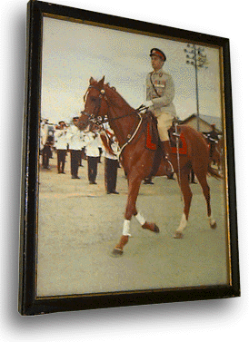 Who is the mysterious Toilet Dictator? Perhaps someone in cyberspace can identify this natty-looking martinet. The Toilet Dictator is astride a red horse, in front of a raw-looking tin-roofed building, some low stadium lights and a squad of trumpet-playing flunkies in dinner jackets. Hešs decked out in ribbons and a Sam Browne belt, and dangling what looks, to these uncertain eyes, like the Order of St. George from his sunken chest.. That the thrift shop in question is near a row of poorer embassies, near the James Buchanan Monument--a story all in itself--may give some clue to the dictatoršs origins. The expensively framed photo probably was donated by one of the embassies to someone who got rid of it, not wanting a picture of the man on their wall. Or was he the victim of some house cleaning at his own embassy after some unguessable political troubles? Where is he from? Uruguay? Brunei? Malaysia? I keep him on the wall, in the smallest room of the house, a power behind the throne, so to speak, as a reminder of the horrific penalties for lapses in good hygene, and of the punishment awaiting those who disrespect the image of Our Leader.