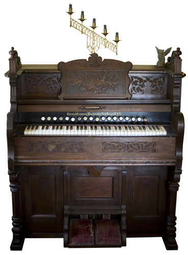 "There was a note that said it was the original pump organ from the Masonic Lodge," says Flock of this ornate, wood-carved pump organ made by the Cornish Company of New Jersey in 1876. Discovered at downtown Santa Rosa's late Helping Hearts thrift store, which was known for pricing items cheaply to clear space from their too-small store, the 134-year-old pump organ set Flock back just $400. Its pull knobs are hand-lettered in gothic font, and, yes, it still plays.