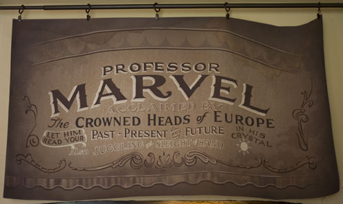 Late last year, graphic designer Jon Heilman created replicas on canvas of Professor Marvel's traveling sideshow wagon, which astute film lovers will recognize from a brief, early scene in The Wizard of Oz T. "I kept looking at it, and thinking, 'Where could I put it?'" Flock says, "and then I realized I have this giant crack in the plaster wall here that never goes away. There's no patching that crack, it's just going to come back, so I was doing myself a favor by buying it."