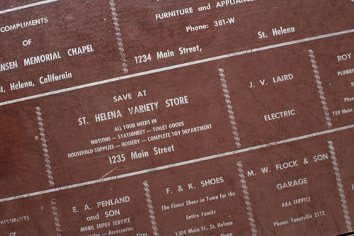 On Flock's living room wall hangs an old card table, which advertises numerous and mostly now-defunct businesses from the upper Napa Valley like Keller's Meats and Donaldson's Hardware. What makes it special is the inclusion of his great-grandfather's service station, M.W. Flock & Sons, in Yountville. On an adjoining wall hangs a picture of his grandfather, manning the pumps, although there was said to be a roadside attraction atmosphere around the place. "He had a monkey, I heard, and a real live dancing bear named Coco to bring people in," Flock says. "Our eccentricity goes way back in this family."