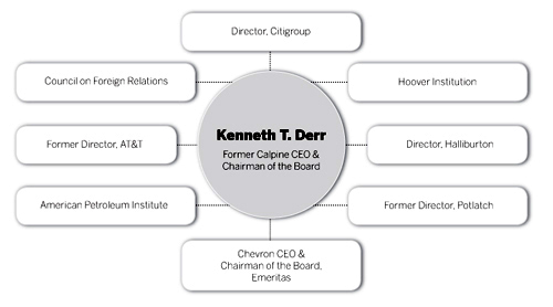 Derr is the oldest and most prominently connected member of this troika of well-connected execs. Derr was named to Calpine's board in 2001. He served as Calpine's interim CEO until Bob May came aboard to guide them through bankruptcy.