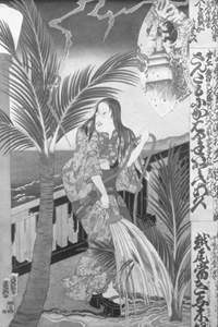 Drawing upon this "floating world" tradition and its arts, Teraoka set about systematically taking ukiyo-e styles out of the realm of the Shoguns and onto the beaches of L.A., using recurring images as individual shorthand. Ancient text, a script known as "jojuri" that is tantamount to Middle English, accompanies the images in cartouches placed throughout, sketching out jokes that Teraoka admits even he can't often remember. Tissues, an old-fashioned visual reference to carnal pleasure, and condoms, a new-fashioned reference to sex as death, abound. Octopi pleasure women eight different ways while jumping catfish presage disaster.