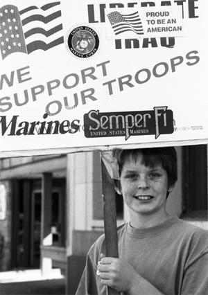 Gateway: Sebastopol, 12:35pm. A boy rallies for the troops at the town's weekly protest against the war. Photograph by Chelsea Walsh.