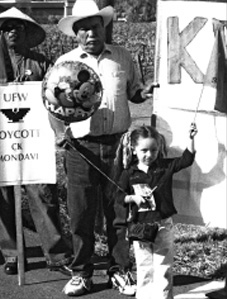 Grandpa and girl with balloon: St. Helena, 1pm. Little girl and balloon with UFW protesters outside of CK Mondavi Vineyards. Photograph by Francesca Longlin.