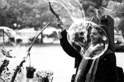 Flag: Occidental, 4:40pm. Terry Ann Gillette laughs while making bubbles outside of her shop, the Flying Turtle. Photograph by Claire Sloan.