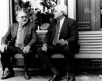 Men on bench: Healdsburg, 5:45pm. Two businessmen chat while waiting to be seated at a restaurant. Photograph by Freesia Levine.