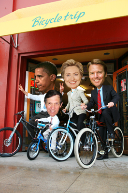 Poll Playing: It was a lovely weekend before Super Tuesday when Democratic presidential hopefuls Barack Obama, Dennis Kucinich, Hillary Clinton and John Edwards set out from Bicycle Trip, voted Best Bicycle Shop. Unfortunately, Bill Richardson never even made it out of the store.
