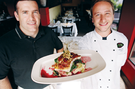 A halibut good dish: Owner John Mootz and chef Tom Slatt present Sestri's pan-seared Alaskan halibut with blood orange vinaigrette.