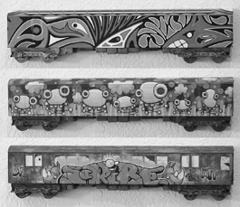 How Would Thomas Look?: The work of Cameron Tiede, Ryan Crippen and Scribe is on display at 'Derailed,' an exhibit of graffiti on toy trains.