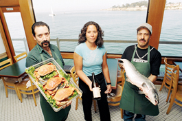 A list of weekly specials augments the familiar menu of tried and true favorites, including my personal favorite, the mighty crab and shrimp sandwich ($9.95). Lyle took his time, combing the menu. In addition to the seafood salads, burgers, chowders and pastas, the weekly specials included cracked crab, skewers of chicken and prawns, grilled tilapia and--wait! something jumped out at us--Orange Rosemary Salmon ($12.95). Yes! That was just what Lyle needed. We sipped our cokes and considered just why the wharf always casts a spell. An enormous band of prehistoric pelicans landed in the water just outside our window. At the far horizon sat the lighthouse, punctuating the line of familiar architectural landmarks along West Cliff Drive. The cliffs, the beach, and behind us, the long vista of Boardwalk, Casino and Big Dipper--this has got to be one of the most Santa Cruz spots in Santa Cruz.