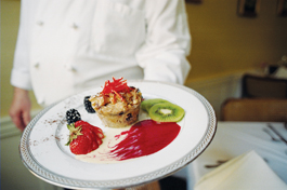 Dessert of warm bread pudding ($7) was a charming surprise. Light years from what the phrase "bread pudding" usually conjures, this voluptuous dish was light, multilayered and just plain fabulous. The reason? Well, miles of technique, for one thing. But the other was that this creation was fashioned from croissants. All the golden layers were gently bound with a Grand Marnier-spiked crème anglaise--a sensational choice. More of the classic crème anglaise filled the entire plate, adding an orange top note to accompanying strawberries and mint leaves. The warm, custardy tangle of croissant was perfumed throughout by a microzest of fresh orange peel and adorned on top by a light sifting of powdered sugar. We ate every trace. A destination dessert with a rich French accent.