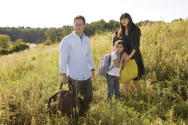 FIELD-GOOD MOVIE: Mark Wahlberg, Zooey Deschanel and little Ashlyn Sanchez trek through the wilds of Pennsylvania in 'The Happening.'