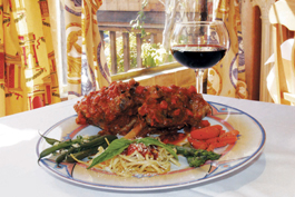 Soon after I waved the white flag over the appetizer, the grilled California sea bass ($21.95) was spirited to my table. A generous fillet was covered in a rich and savory Mediterranean-style sauce of tomatoes, Kalamata olives and capers. The dense white flesh of the fillet was flaky and grilled to perfection. Another bundle of eggplant also graced the plate, this time filled with rice. And sitting squarely on the side was a special treat the size of a large postage stamp: a dense jewel box of au gratin potatoes. I enjoyed one heavenly bite, hit my cheese quotient for the time being and moved on to the vegetables. At a point in the summer when I thought I could not eat one more zucchini, I was pleasantly surprised to find the spears of sautéed squash and carrot remarkably tasty. Perhaps it was the judicious measure of garlic sprinkled over the top, the color, the counterpoint to all the rich cheese or the measure of solitude with which I had to enjoy them. Who knows what magic transpired?
