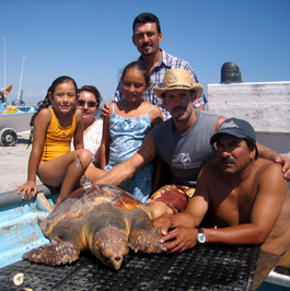 One Big Happy Family: UCSC doctoral candidate Hoyt Peckham, in hat, is pictured with two fishermen of Punta Abreojos in Baja California and their families preparing to release a loggerhead turtle with satellite transmitter.