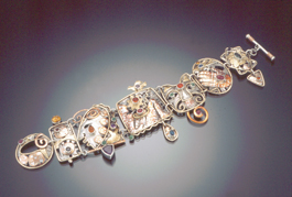 "I travel a lot and that's one of my big inspirations, and I started this whole Mayan series after going to the Yucatan," she explains, holding up a beautifully detailed bracelet layered with various metals and featuring a Mayan temple in the center. "I love to paint because I love to color, but the way that I get colors into these things is using different stones for the accents. And that's the idea of using the mixed metals."