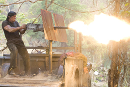 AFTER George Orwell was a British policeman in Burma, the author claimed that his greatest desire was to drive a bayonet into the guts of a Buddhist priest. That's the effect of thwarted imperial ambition on even an essentially gentle person. Today's audience would rather see the bayonet go into the guts of a Burmese soldier, and Sylvester Stallone is happy to oblige with Rambo. Jabbering Southeast Asian guys saying the Burmese equivalent of Team America's joke dialogue "durka, durka, durka" may not be the North Vietnamese soldiers Rambo wanted to get his hands on back in '85, but they fit the general profile.We see Rambo first in the Thai bush, harvesting serpents for a cobra-taunting show that draws the tourists. He is still pretty much the same crestfallen steer he was 20 years ago. He doesn't talk, he lows. The spray-painted advertisements make Rambo look a lot like Che Guevara. Here, though, he's more like Charlie Allnut, the pilot of The African Queen. Since he owns his own riverboat, a missionary (Julie Benz) and some of her partners hire him to bring them up river. Rambo knows it's certain doom, but anything to please a lady. As we can see from the lovingly excerpted scenes of Myanmar war atrocities, the county is unsettled. Shortly after their arrival, the Burmese (not Myanmar) Army shells the village, rapes the women and the little boys, blows up the rice paddies and throws the missionaries into the pigpen. The White Woman, of course, is kept for special despoliation. I don't know how many times her captor shines a flashlight on her and leers. (There was a line they reportedly used in the silent film days, "Ah, me proud beauty ..." It would have come in handy here.) With a boatful of annoying mercenaries, Rambo returns to attempt to rescue the girl, his only reason for risking his vast neck. Rambo is capped with Stallone's answer to the Omaha Beach sequence in Saving Private Ryan, only with more computer animation of subhuman Southeast Asians flying apart. Going to this and complaining about the gore is like sticking your head in a sewer and complaining about the view. It's such primordial filmmaking: these movies take place in the swamps for a reason. What's left for Rambo to fight, Grendel? It isn't much to look at, though—Rambo: First Blood Part II, directed by George Cosmatos, boasted lusher jungles. Contrast this Rambo with the fantastic emerald-hell that Werner Herzog unleashed in Rescue Dawn, and it's just a digitized steam bath. The magenta cloudbursts and flying tomato paste add a little color to the olive-drab color scheme. Author John Mueller of Ohio State University drew up a chart that pegs the body count at 83; up four from the last film, in 1988. I frankly don't know how one could keep count, watching Rambo peppering soldiers with some kind of high-caliber machine gun. The bodies flew apart so fast it's impossible to tell who belonged to what. Nice to hear—from the children's voices in the theater—that Stallone still knows how to make good upbeat family entertainment.