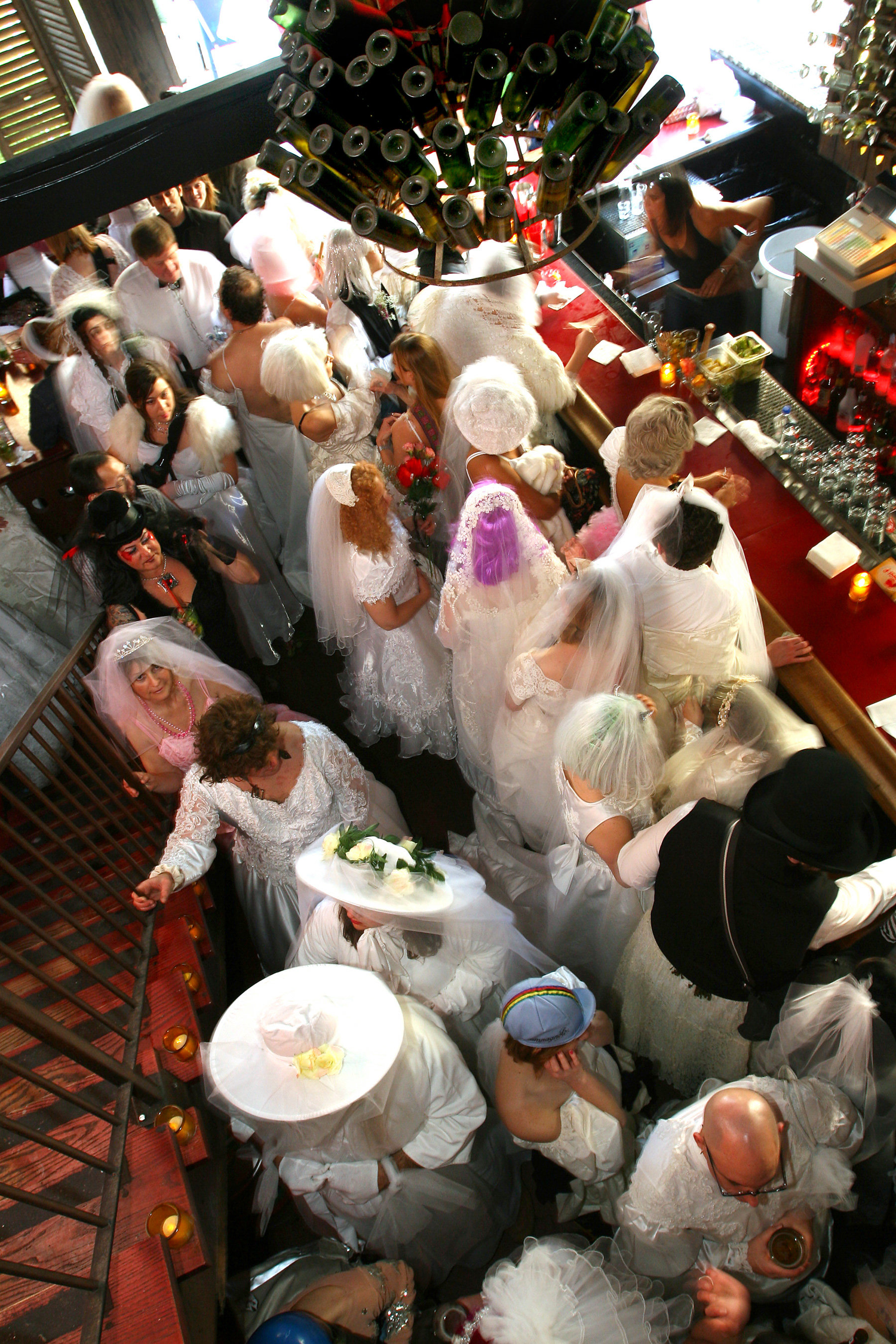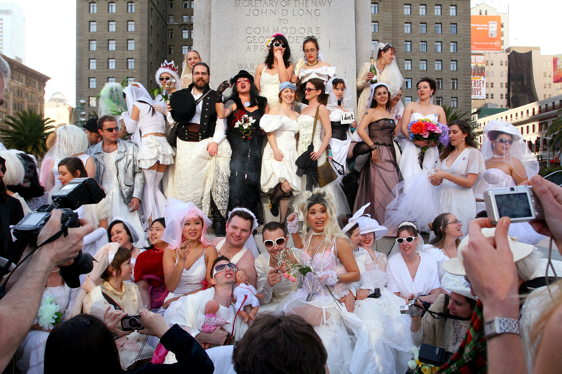 The Cacophony Society organizes the Brides of March every year, ensuring that the streets of San Francisco surrounding Union Square are taken over by men, women, aliens and gorillas in wedding dresses for a day of drinking and confusing the tourists. In 1999, Michele Michele came up with the idea in a thrift store after seeing racks and racks of used wedding dresses being sold practically two-for-one and "realized how often the dreams of an idea marriage had failed and how so much of this dream has been fabricated in order to fuel the ever-increasing consumption of new products."