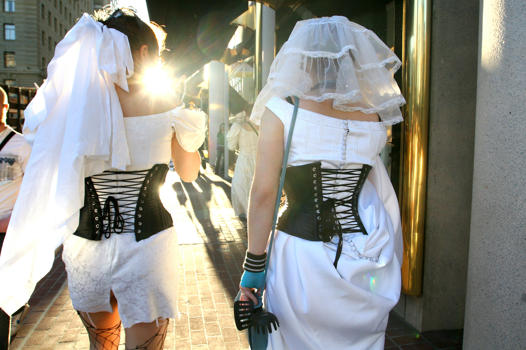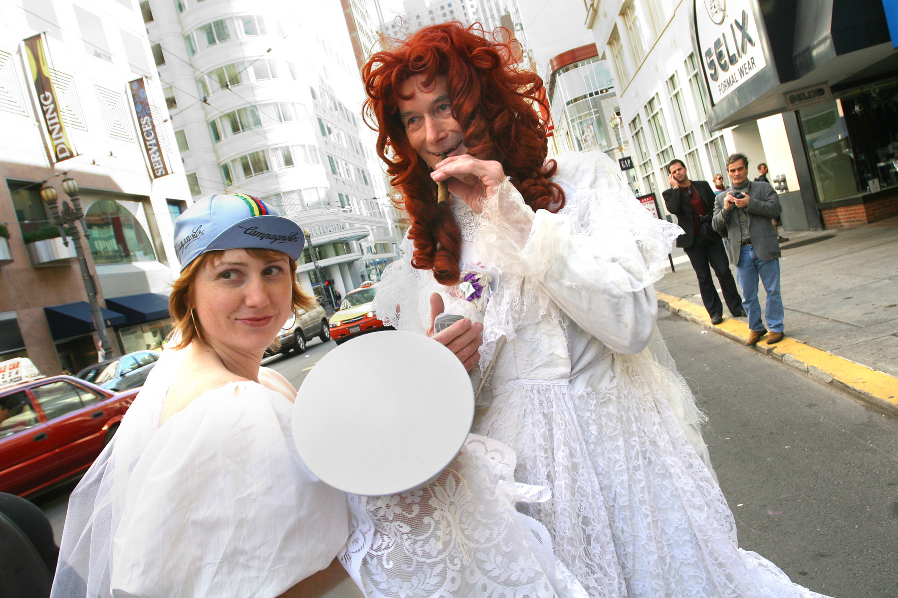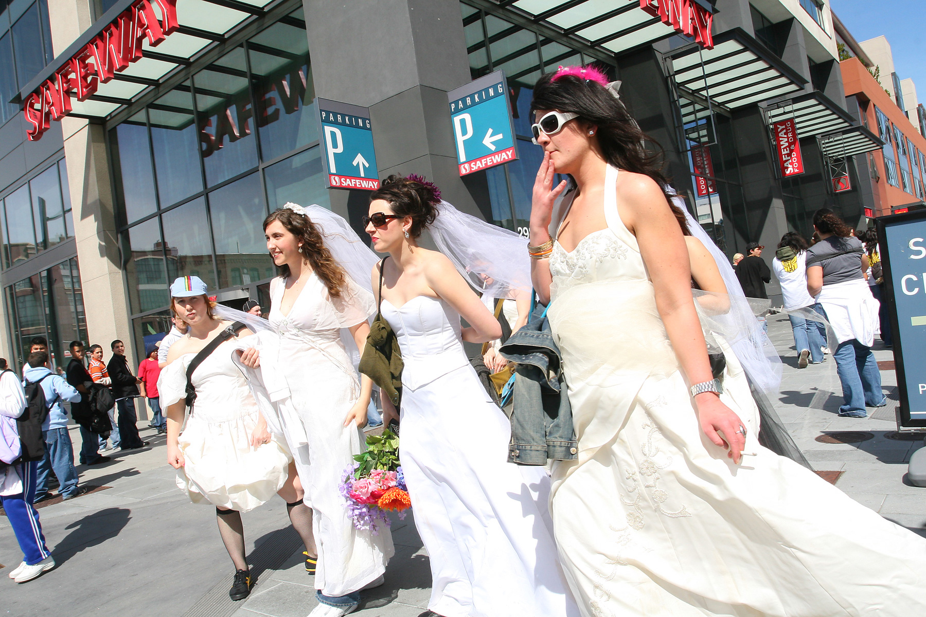On March 10, in wedding dresses, we boarded the train from San Jose to San Francisco armed with champagne and flasks of whiskey in preparation to take our bridal march through, over and around Union Square. Since we got to Ginger's Trois, the meeting place, an hour before the bar was to open, we headed to a near by deli for a nonliquid lunch. We did not have long to wait before the street was filled with white dresses of all shapes and sizes.