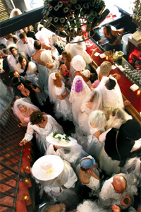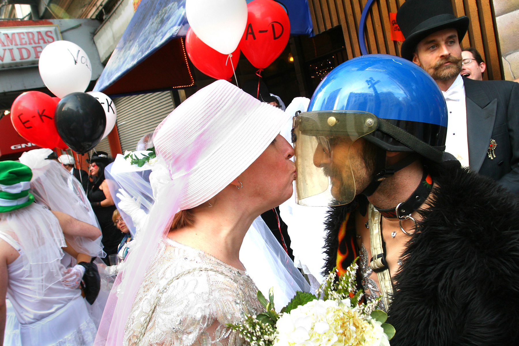 Our route through Union Square took us to a tuxedo shop to find grooms, Victoria's Secret, the lobby of the St. Francis, Walgreen's for pregnancy tests and even Tiffany's. And our welcome is always the same—we're asked to leave. If everyone gets 15 minutes of fame, ours are quickly wasted in the vacation photo albums of the tourists who stop brides in the street and ask them what the event is all about. Many brides respond in character, telling the confused tourists that this is their special day but all they need is a groom and they would appreciate help in finding one.