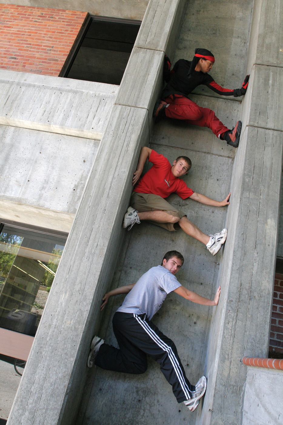 Going vertical: From top to bottom: Ryoga Vee, Eric Sundstrom and Nick Elias climb parkour-style. (Full-size version)
