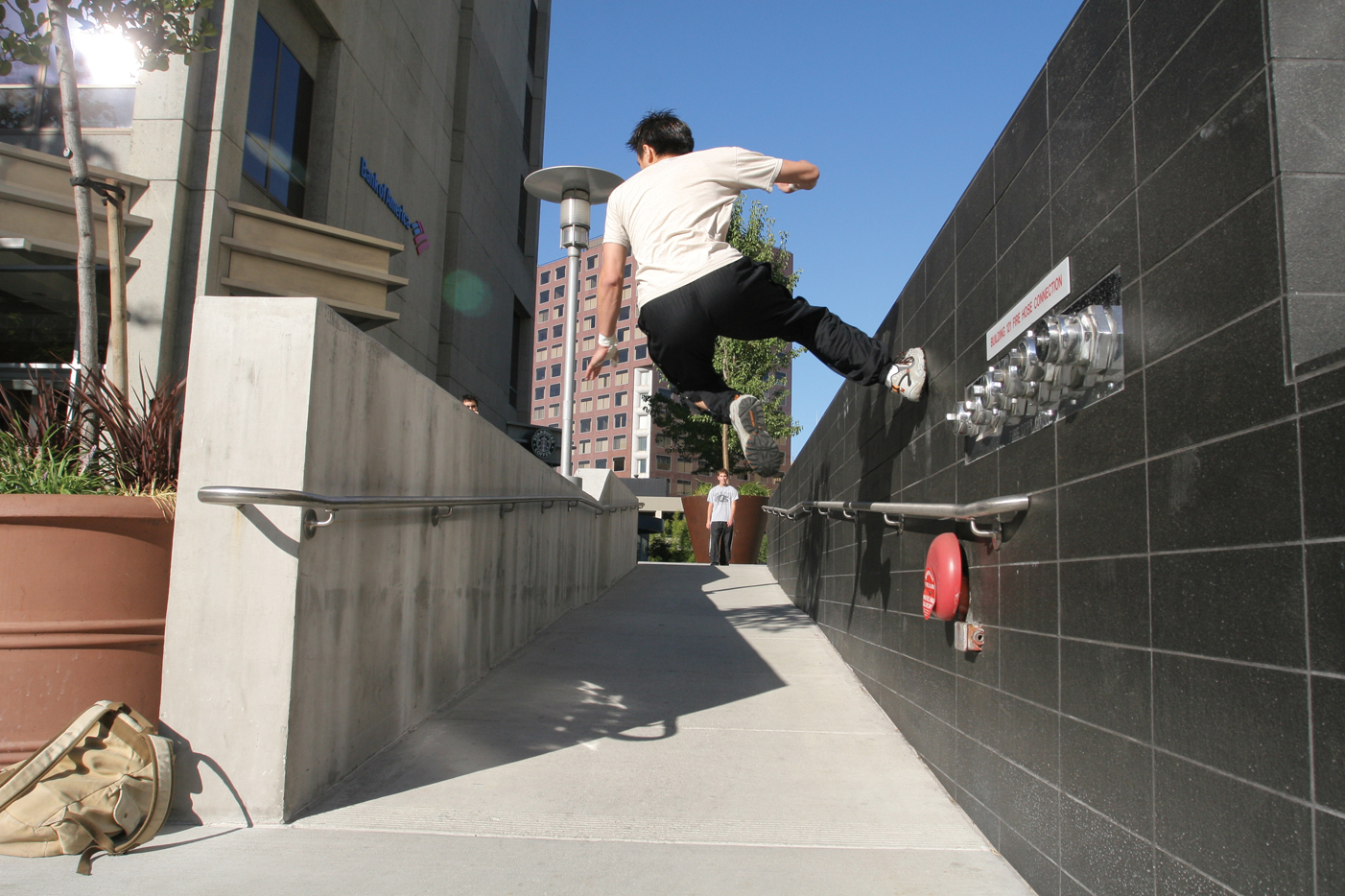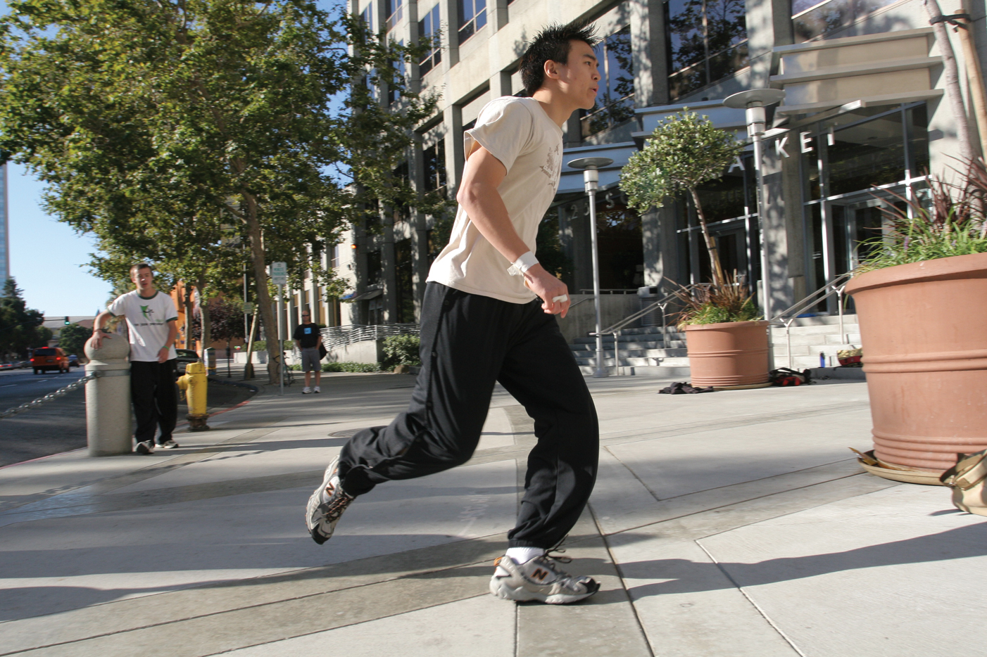 The sport is still young in the South Bay, much like its practitioners. Matt Trinidade, along with a few others, has put together a team of athletes that get together at least once a week to train and practice basic moves like transferring weight into a rolling maneuver after a high drop to relieve stress on the joints from the impact. Stretching is also important, as many of the stunts require a great deal of flexibility. Sessions are held bright and early, in as many different locations as possible. The idea is to learn how to conquer each and any obstacle.
