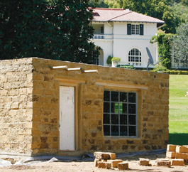 For "Iraq: Reframe," Bilal has constructed a pre-modern Iraqi house on Montalvo's front lawn, mimicking the one he was forced to build in a Saudi Arabian refugee camp after his public expressions decrying the invasion of Kuwait got him run out of Iraq. The house is made from a simple mixture of clay, sand, rocks and water. This style of home building had been phased out with Iraqi modernization, but years of war and sanctions brought it back, making the house a symbol of Iraq's deteriorating physical and political infrastructure.