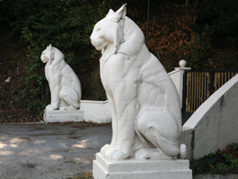 In 1955 Bruce and Diane Ogilvie bought the estate, and named the sculptures Leo and Leona. Vandals struck again in June, 1964. For those of us who love the cats, the press photograph is painful to look at: this time they knocked off one cat's ears and the top of its head. The damaged cat looks eerily more ferocious than ever, with its slanted eyes wide open.