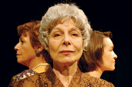 THE GENERALLY caustic playwright Edward Albee must have blinked a moment of moderation when he wrote Three Tall Women. The play front-loads the harsh realities of a dying woman into Act 1 and then eases into a fascinating study for Act 2. The 92-year-old woman referred to as "A" (Diane Tasca in this Pear Avenue Theatre production) is attended by her middle-aged caretaker "B" (Monica Cappuccini) and the young lawyer in charge of her financial matters, "C" (Rebecca J. Ennals). As house-coated A goes from sitting chair to bathroom and back—sometimes coherent and biting, other times rambling and trembling—a grand, pillow-laden bed dominates the set, a looming reminder of the "final resting place."