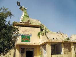 BASRA DREAMS: Um Mohammad's picture of a cultural center shows the black flag of a fundamentalist group.