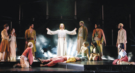 The possible exception to this production's sapient innovation is the Buena Vista Social Club rendition of Herod's song, "So You are the Christ." Its Latin beat drags some of the levity down, but the gabby chorus girls and Aaron Fuksa's Don King scare-hair, as Herod, are pretty irresistible. Lighting designer Rick Belzer often painted like a Grand Master around the Christ, for example casting him in oblique spots so he emerged from the others like some ambiguous Caravaggio hero. At times, Neeley appears struck by lightning or by words, as in the fascinating leper's lament "See My Hands." The music, singing and action in this show are so gripping that scenery (a catwalk across a multileveled stage) becomes irrelevant, and new sets and characters can emerge suddenly from behind the action and still come as a surprise. This mature production surpasses the general run of remakes and rather than redoing Rice/Webber's complex statement, ripens it.
