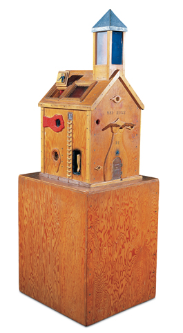 The star of the show is Mad House (1958), a sculpture in the shape of a church with a tall steeple. Various openings—a carved red hand forming a circle with thumb and forefinger, a cut-out eye, ear and mouth, the legs of a torso and various doors and windows—allow us tantalizing half-views of a complex interior where a man plucks out his eye and a monkey wears a baseball cap. Shafts of light from the orifices illuminate the action, as if this were a movie house of horrors. The sides of the building are painted with gnomic clues: "Have You Joined the Team Yet?" "For Those Who Aren't Right." In the belfry, a toy soldier—perhaps a stand-in for the artist—forever marches off to society's unending wars.