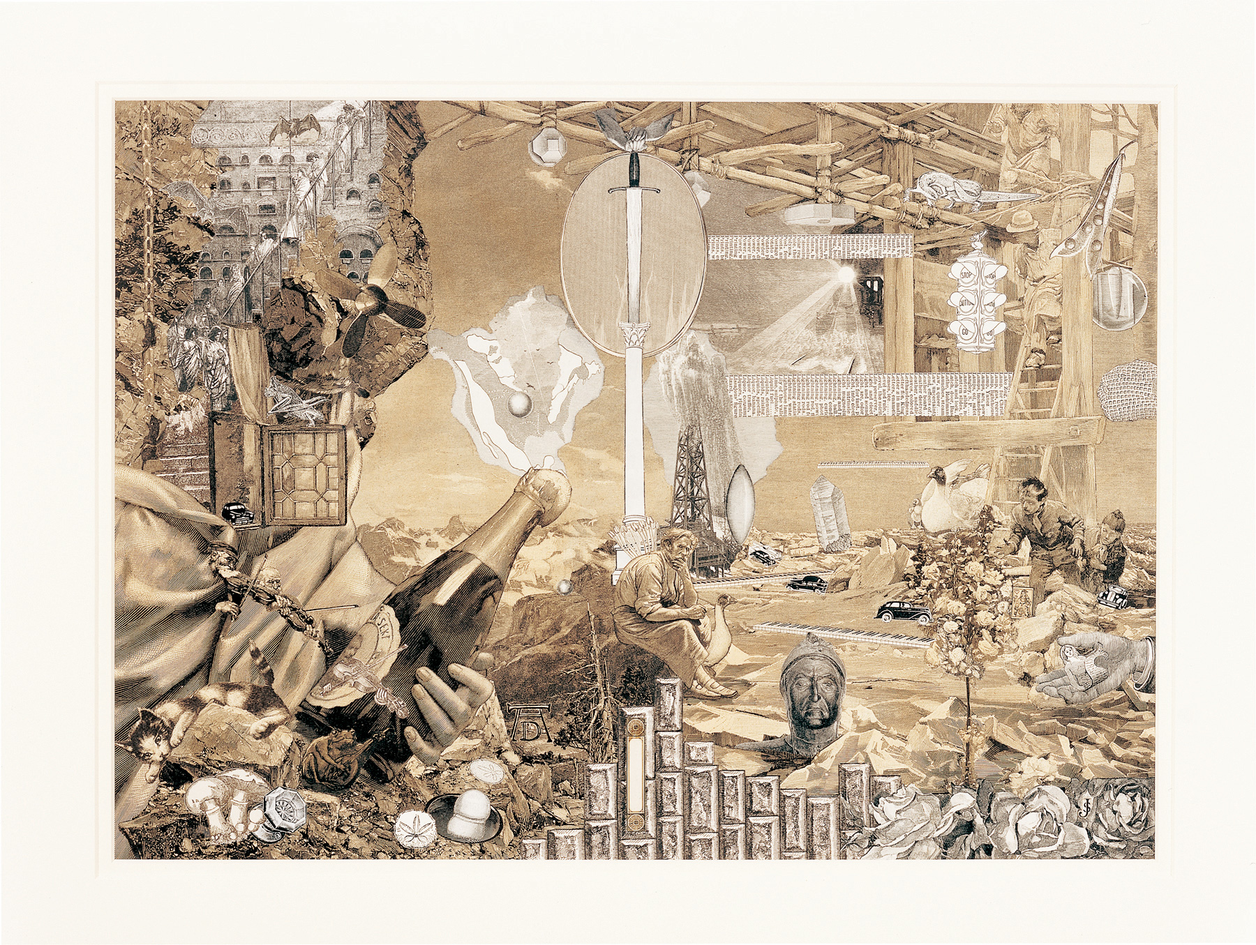 Later, Jess let the words fall by the wayside and concentrated on accumulating layer upon layer of images. In these increasingly complicated constructions (done as broadsides, book covers and stand-alone art pieces), tiny worlds proliferate. His Cover for The Mutabilities, for instance, sends miniature black sedans careening across piano-keyboard roadways past monumental crystal formations while a champagne bottle the size of Big Bertha erupts and a locomotive chugs out of a tunnel toward an erupting oil derrick.