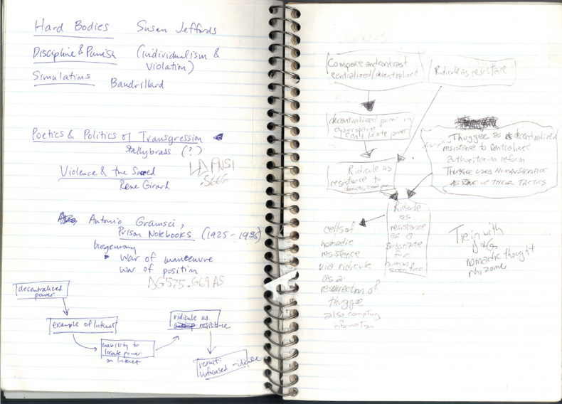 So I drove my 1970 Plymouth up to Berkeley, where she was working on her Ph.D. dissertation on images of monsters, psychopaths and capitalism in 20th-century American pop culture. Over coffee, we talked about resisting the power of late capitalism by engaging in shadow tactics of ridicule and anonymity inspired by the 19th-century East Indian strangulation cult, the Thugs, in their resistance to authoritarian British colonial rule. Since the Thugs would engage in human sacrifice for the goddess Kali, I suggested using human sacrifice as a metaphor for artistic expression via transgressive ridicule in cyberspace, and Newitz turned me on to René Girard's Violence and the Sacred, a fantastic exploration of the alliance between violence and religion. I still have the notes and flow charts she drew during that conversation. They contain boxes and arrows showing me how to focus the ridicule I was attempting to express in that particular essay. It was precisely this sequence of events—a series of conversations with Rucker and then one with Newitz—that pretty much made me want to be a writer. Yep, it's all their fault.
