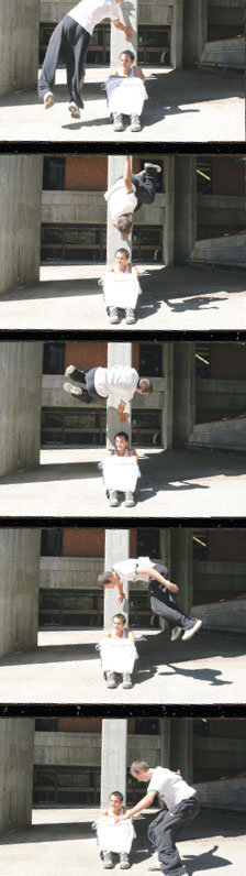 Recently parkour has become a full-fledged phenomenon, finding its place not only in the urban jungle but on the big screen as well. In the now-famous opening chase of this year's Casino Royale, Sébastien Foucan took James Bond and the audience through every nook and cranny of a 40-story building under construction, jumping through holes, and from crane to crane, and then some. Foucan was part of the founding parkour community, but he moved on to what is called "free running," which is fundamentally a version of parkour based more on acrobatics than efficiency.