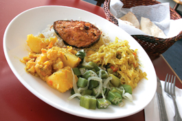 The big knobs of bony, gray mutton didn't bowl me over, but a sultry, coconut milk–bathed "cabbage special" and garlicky shaag (spinach) bhajee nearly made me swoon. Polau (basmati rice with caramelized onions, green chiles, milk and butter) was fragrant with cardamom and cinnamon, and a catfish curry offered moist hunks of meaty fillets.