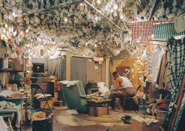 In one of the best works, After "Invisible Man" by Ralph Ellison, the Prologue, Wall constructs the basement room where Ellison's unnamed black narrator inhabits a shabby, cluttered self-contained world exposed under a ceiling full of hundreds of bare light bulbs sucking power illegally from the municipal grid. Blankets cover the doorway; the man is figuratively walled off from the above-ground world, where he is invisible to white society.