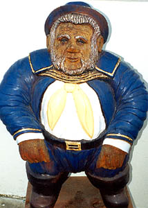 JOLLY CAPTAIN BRIGGS stands guard in front of Leonard McKay's tiny shop, Memorabilia of San Jose, at 250 West St. John St. (The original redwood Captain Briggs graced San Jose cigar store sidewalks from 1872 to 1936.) Leonard sometimes laments the name of his business, "Memorabilia is too long and nobody can spell it." And the location, a gnat's ass from being under Highway 87, is not calculated for foot traffic. "I've only had one customer in two weeks, and that was a burglar," he quipped.