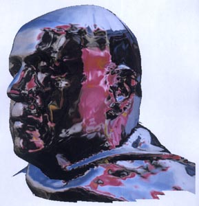 Within moments an image of the viewer's disembodied head, able to be rotated 360 degrees in any direction, appears onscreen at a nearby console. With the click of an icon the familiar human flesh blinks out and a different skin overlays the cyberhead's 3-D line frame: marbled granite, green scales, iridescent titanium. It's fascinating but disturbing, this protean thing that is both familiar and foreign, made to morph at the click of a mouse. There is the recognizable valley of the eye socket, the rise of the lip, but they belong to a prehistoric green swamp creature or a mute piece of stone, milky and ghoulish.