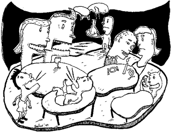You can start by not letting your children resemble feral creatures who were raised in the wilderness by pigs. You may love to hear little Susie screaming about the Teletubbies, but the people at the next table might not. Doting fathers might find it a sign of budding testosterone that little Jason and Noah wrestle over the antipasti, but others won't. This is not the laissez-faire '70s; letting your child howl at the top of his lungs is no longer de rigueur. Zip his lip when you're dining out--or invest in a babysitter. Rude children should not be inflicted on innocent bystanders.