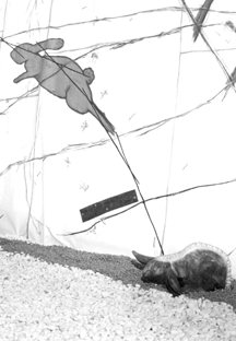But the biggest impact (pardon the pun) is made by William Degen Fleig's installation, I Could Be an Accident on the Freeway. A cockeyed chamber of horrors covered with Fleig's crude charcoal drawings on stitched-together butcher paper, seams painted with Betadine, it presents a world populated only by stone rabbits with cast-wax exposed vertabrae, distant traffic and the demons of an uncertain obsession. Repeated images of an unlatched gate, a wide-open mouth, red rabbit targets, daisies, rocking chairs and Xeroxed childhood snapshots combine with permutations of the same words over and over to imply a traumatic narrative fractured by a disturbed mind.