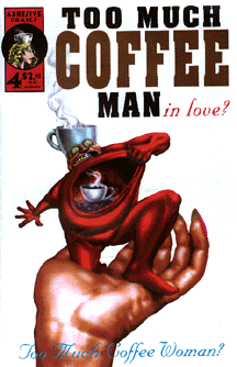 Naturally, the best-known underground java man also appears on a page of Coffee World: Too Much Coffee Man, a self-published minicomics character who has worked his way up to commercial appearances on MTV. Issue #4 of Too Much Coffee Man ($2.50; PO Box 5372, Austin, TX 78763) features several stories in a new vein about the bulbous wired-up character with a giant steaming coffee cup for a hat.