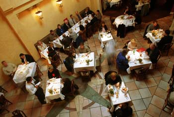 Near the graceful polished wood of Adobe Creek's sophisticated bar I spotted my dining companion. I could instantly pick her out in a crowd by her blonder-than-blondeness. Lanni was sipping Pellegrino and checking out the two-story atrium dining room with its stone tile floors and balconied private banquet rooms. Definitely a vibrant dining scene, I agreed, as we took a corner table next to a 12-foot ficus and allowed our skin to be flattered by the soft terracotta and butter wall tones. Rapidly filling up with a high-spirited crowd--even at mid-week--the central dining room was reflected, Parisian-style, in a mirrored wall far in the back.