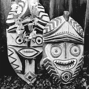 Final Note: Photo is of actual wooden tikis that graced the walls of Hawaiian Gardens (courtesy of Don Feurbacher).