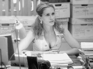 In its realistic style, Erin Brockovich is the kind of film that only gets made if a star loves it. Roberts plainly did. The problem is that she injures the movie with her love, turning up the volume on Erin into a big star performance. At best, a movie star can distill the hopes of the audience, creating an image of one's better self--the way you want to be and think you ought to be. At worst, a movie star is a person who is always right, and that's the way Roberts plays Erin, and that's what mutes my enthusiasm for this film. She's always right, right to neglect her children, right to swear at the people she works with, right to bully her boyfriend (Aaron Eckhart). Throughout the movie, there's never a moment in which Erin's not in the right, or even a moment in which we're allowed to think that if she turned down her personality a little, her goals might still be accomplished. I suppose women are accustomed to this 110 percent righteousness when male movie stars indulge in it. Erin Brockovich is sauce for the goose, but I don't like that sauce when the gander wallows in it, either.