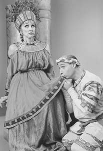 For the lead role of Psuedolus, a mischievous household slave who plots to earn his freedom by matchmaking for his master's son (thereby setting in motion a scheme that quickly careens out of control), Jamie Torcellini draws both on Zero Mostel's bawdy original and Phil Silvers' steely 1972 Tony-winning revival, adding an appealing rough-and-tumble physical element and a self-effacing humor. ("Hair Club for Men," he improvised when his headband--and hairpiece--fell from his pate after one first-act comic tussle. "I'm also a client.") The supporting players are all equally strong--particularly Jay Rogers as Hysterium, the excitable head slave, and Joseph Ribiero as Lycus, the "procurer of courteseans."