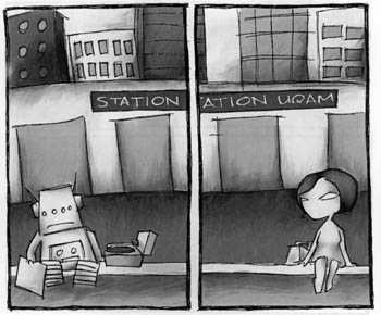 "I was playing around with a bunch of little ideas and started centering around one robot character and a girl. By the time I was penciling the story, I had [it] from beginning to end. It took months creating random scenes and trying to link them together. [It's like] making music from a turntable perspective; you take pieces that you enjoy and try to fit them together. It's very similar to writing a storyboard for a little film that we don't have the budget for."