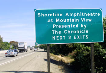 CALTRANS DOESN'T KEEP TABS on items such as "Longest Title on a Highway Sign for an Exit," but Eye has a nominee, spied on U.S. 101 southbound last weekend: "The Shoreline Amphitheatre at Mountain View Presented by The Chronicle Next 2 Exits." The use of directional traffic signs to promote commercial brands probably started long before 3Com Park wound up on a green plaque, but that was no doubt a watershed in the commercialization of the freeways. Nonetheless, "presented by" might be breaking new ground. ... The brief 'n' sweet marker appeared, remarkably, just days after the Chron announced its five-year "sponsorship" deal of the storied venue. The sign's seemingly immaculate erection left commuters wondering how the Chron managed to kick CalTrans into high gear, but SFX dude Lovester Law assures Eye that the sign issue was getting ironed out months before the announce-ment. "The state wouldn't approve [the change] until the city approved it," Law says. "And that happened months ago." ... Still, the sign's sudden appearance surprised even Debra Hall, the Chron's director of marketing and promotion. "Oh, the sign's up already?" Hall asked Eye. "How's it look?" Hall says the Chron asked SFX to include the sign in the deal, but took a back seat when it came to heavy lifting. "We asked them to give us their best effort, and they said they would, but they gave us no guarantees." The Shoreline, Bay Area residents will recall, was previously sponsored by Apple Computers and Pepsi at separate times--neither of which petitioned CalTrans for a new sign. This is the second rocking venue the Chron has swiped in the last two years, the other being The Chronicle Pavilion at Concord. "We have the exclusive," Hall said of her paper's latest acquisition. "Our competitors got the boot and they can't do any advertising inside the building."