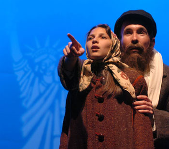 Bound for America: Tateh (Paul Araquistan) shows his daughter (Lauren Hart) their new home in Foothill College's production of 'Ragtime.'