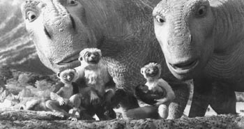 ADOPTED BY A TRIBE OF LEMURS (anachronism ahoy!), a parentless dinosaur named Aladar (voiced by D.B. Sweeney) becomes a Moses who helps his surrogate family of primates into a promised land, shortly after their island is devastated by a meteor. Between James Newton Howard's thundering score and the insipid, sometimes salacious dialogue--something to wake the parents out of the usual Disney-movie torpor--Dinosaur 's story is as flat as its visuals are powerful. As if paying for the parts of the film that ought to delight children, Aladar gives one important moral lesson after another: Share. Don't fight. Keep up with the weakest and the slowest. Here, in short, is the most platitudinous dino since Barney. The dozens of animators handled some real trouble spots in computer animation, in fur and water (some of it faked well with live action). In color, Dinosaur is somewhat less gaudy and faded than is common for all-digital productions. As a technical feat, then, Dinosaur is remarkable; as an overall film it's bland, forgettable and derivative.
